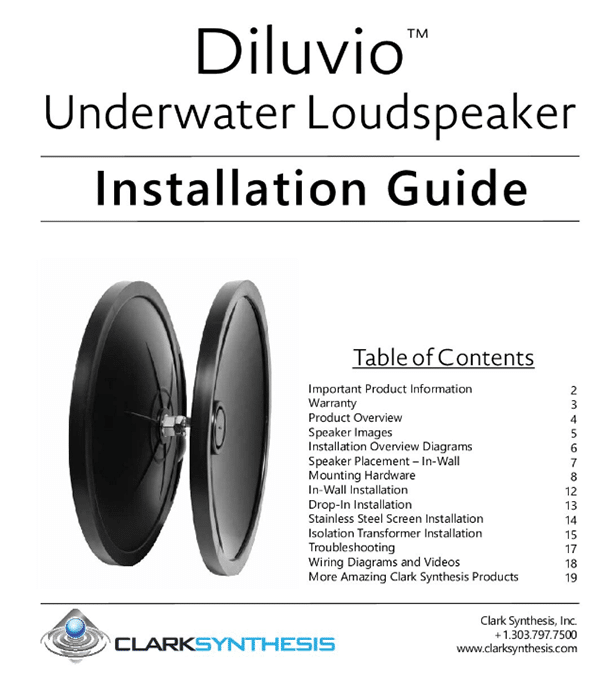 The Diluvio™ can be used in two different ways. For a permanent installation, the Diluvio™ can be mounted inside a large light niche with a face ring kit (sold separately). For users who require underwater sound in multiple locations, such as synchronized swim teams, a tether can be attached to the Diluvio™ so it can be used as a drop-in speaker.